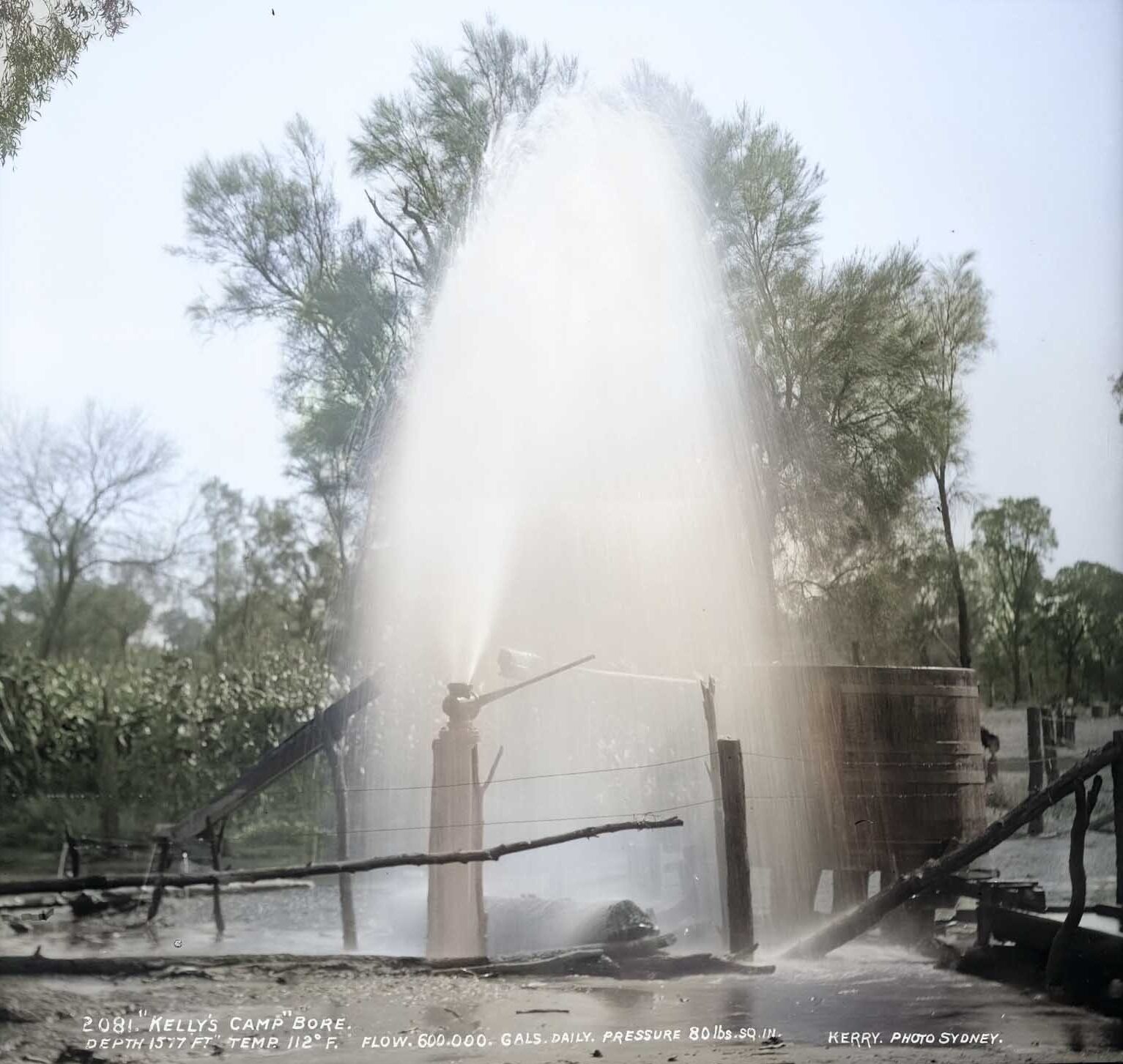 “…Information has been received by the Mines Department that the artesian bore and Kelly’s Camp has been carried to a depth of 1500 feet, the supply of water being increased to 600,000 gallons per day…”
