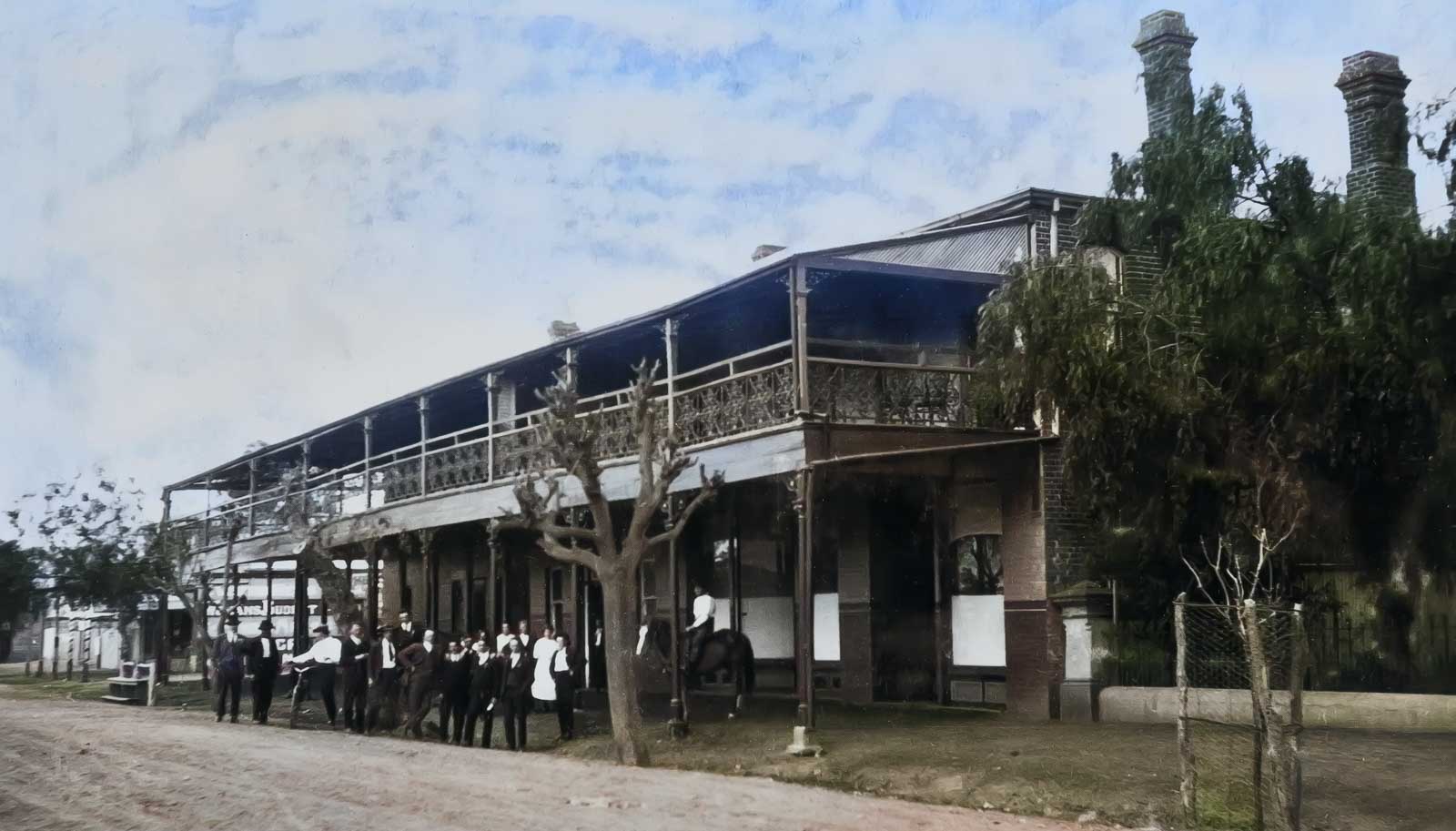 The original hotel was built by skilled stockman, pastoralist and later politician and newspaper proprietor John Edward Kelly. Kelly was born in the Hunter and claimed that his father, grandfather and grandmother were also born in Australia. He began working on properties at 14, and by 17 years of age, Kelly was in command of a station on the Namoi. At 18 he joined Vincent Dowling in establishing himself at Fort Bourke Station, around 1859.