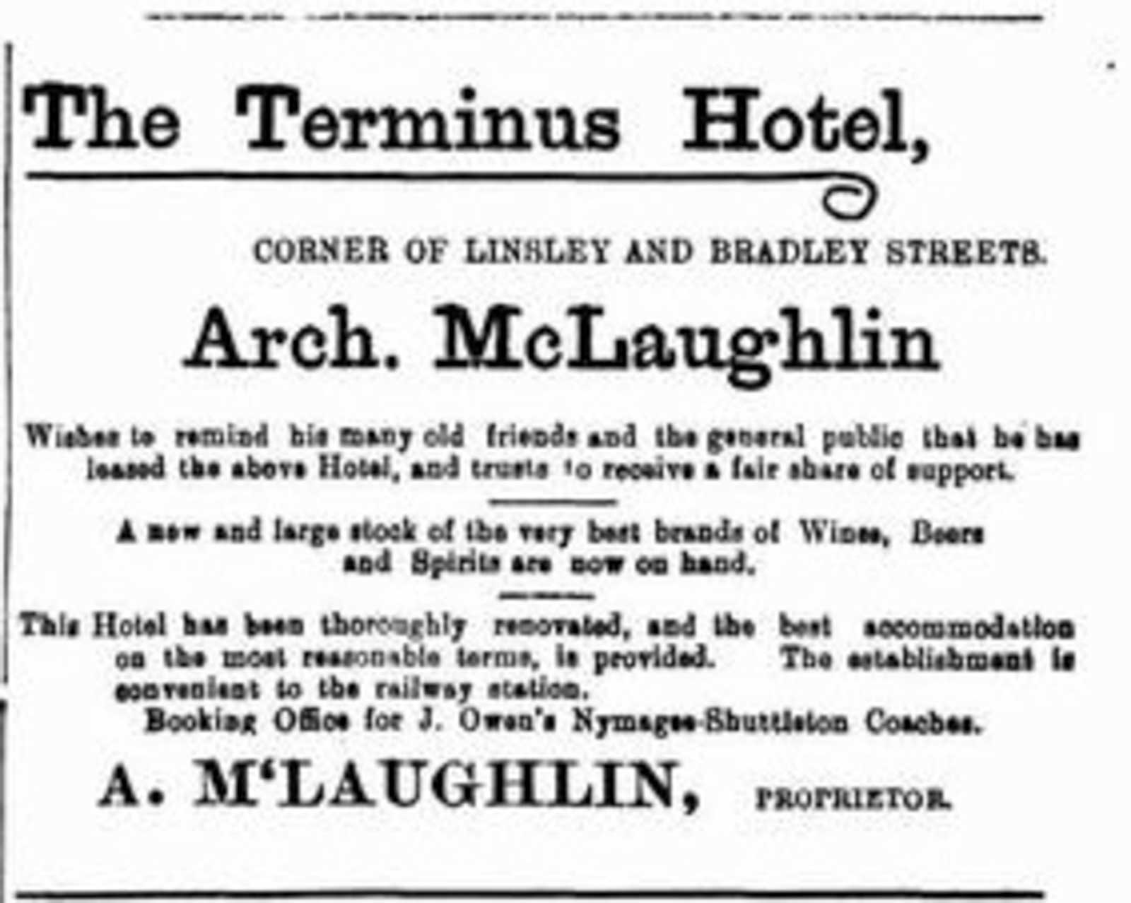 The next licensee was George Killop. He had already been refused a conditional licence for a place being used as a boarding house very close to the station. When the opportunity for the Terminus came up, he must have been keen to seize the next best location. The licence then swapped backwards and forwards between various Killops with a brief stint back with Charles Thomas, a year with Arch McLaughlin (for so long the ‘Boniface’ of the Court House Hotel) before in 1911 it went to Patrick Bernard Daley.